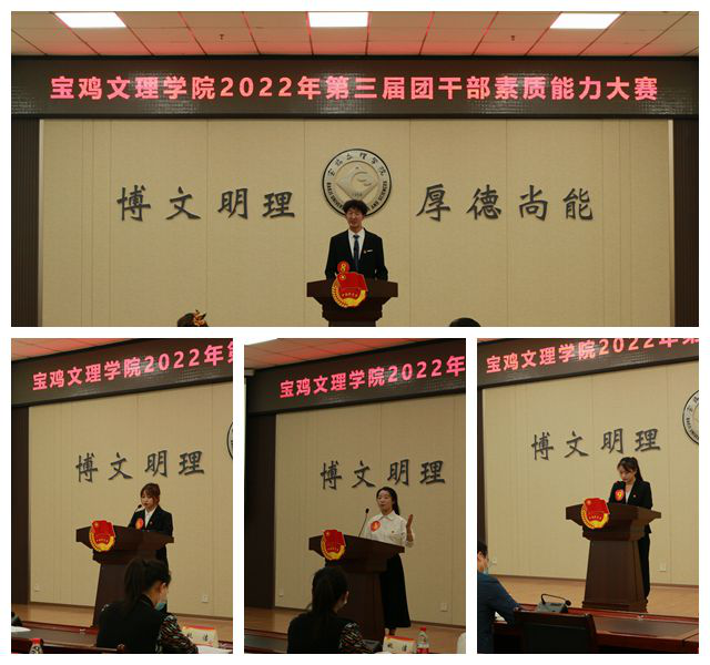 本次团干部素质能力大赛由校团委主办,教育学院团总支和数学与信息科学学院团总支承办。招商银行宝鸡分行左岸新城支行行长姚洁、招商银行宝鸡分行卡中心主任王亿、校团委书记郭理想、校团委副书记杨昕、各二级团总支书记以及团干代表张晓毅、刘余阳分别担任评委。赛后,郭理想作了点评,并对存在问题提出了改进建议。