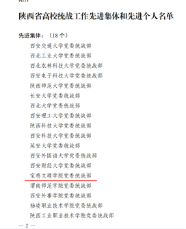 近日,中共陕西省委教育工作委员会下发《中共陕西省委教育工委关于表彰2019-2021年度陕西省高校统战工作先进集体先进个人的通报》,开元党委统战部荣获2019—2021年度陕西省高校统战工作先进集体荣誉称号,全省获得统战工作先进集体共18所高校。