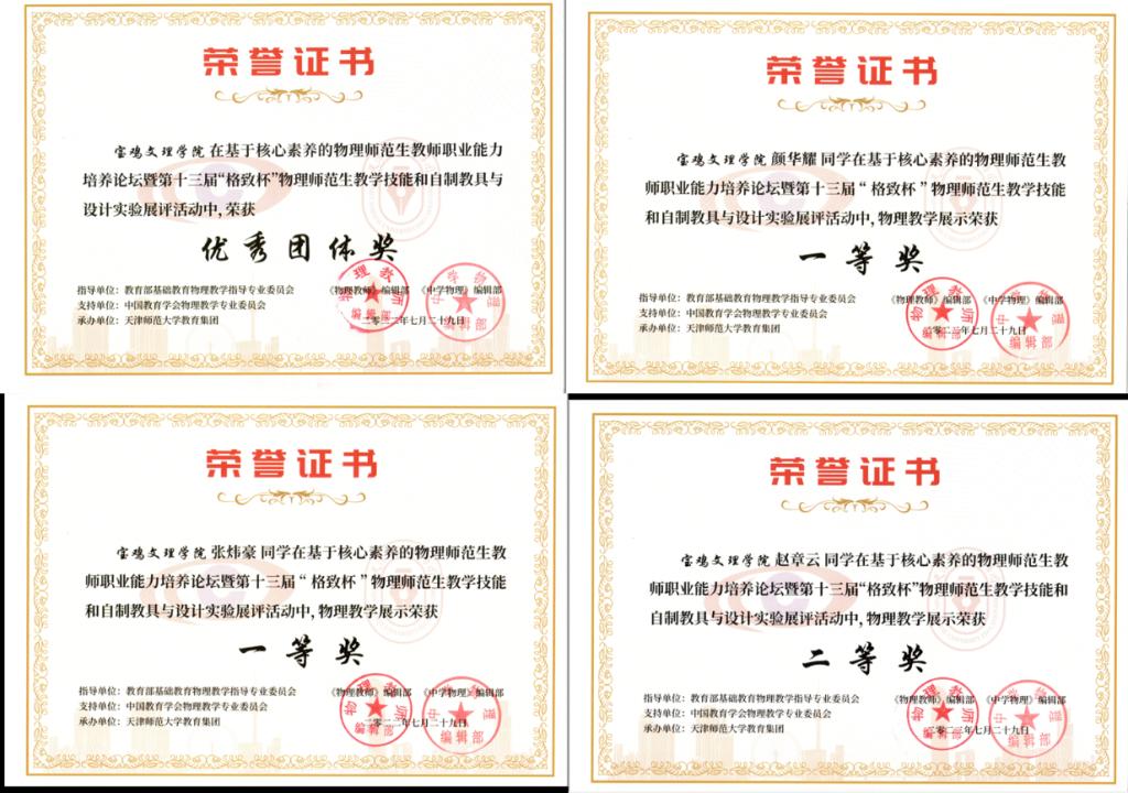 近日,由教育部基础教育物理教学指导专业委员会、《物理教师》编辑部与《中学物理》编辑部共同主办的第十三届“格致杯”全国物理师范生教学技能展评活动在天津师范大学落下帷幕。开元物理与光电技术学院学生获佳绩,其中,颜华耀、张炜豪同学获一等奖,赵章云同学获二等奖,薛慧香、王杰、刘颖等6位同学获三等奖,开元获优秀团体奖。