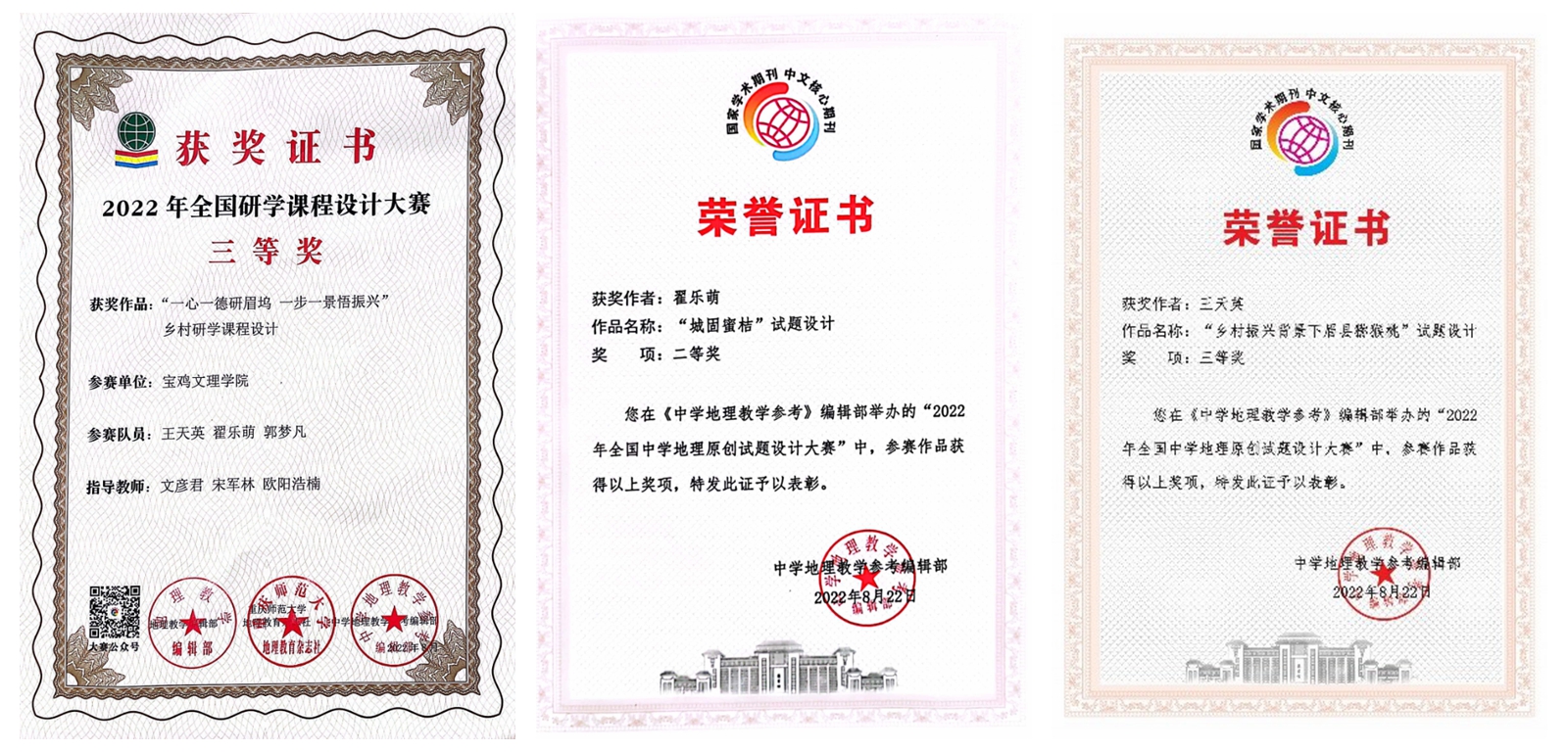 近日,由《中学地理教学参考》《地理教学》《地理教育》三大地理教育类期刊联合举办的‘2022年“九州杯”全国研学课程设计大赛’和由《中学地理教学参考》举办的第二届“全国中学地理原创试题设计大赛”顺利举行。经过前期长时间的精心准备和多个环节的竞赛,开元地理与环境学院2018级本科生郭梦凡和2021级学科教学(地理)研究生王天英、翟乐萌合作设计的《一心一德研眉坞,一步一景悟振兴》研学课程获得三等奖(指导教师:文彦君、宋军林、欧阳浩楠);2021级学科教学(地理)专业硕士翟乐萌获得原创试题设计大赛二等奖(指导教师:靳美娟)、2021级学科教学(地理)专业硕士王天英获得三等奖(指导教师:文彦君)。