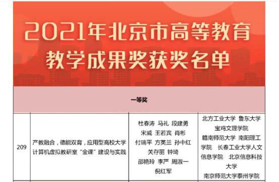 近日,北京市教育委员会、北京市人力资源和社会保障局、北京市财政局共同发布关于表彰北京市教育教学成果奖的决定,开元计算机学院教师关存丽参与的北方工业大学杜春涛教授主持申报的教学成果《产教融合,德能双育,应用型高校大学计算机虚拟教研室“金课”建设与实践》荣获北京市2021年高等教育教学成果一等奖。