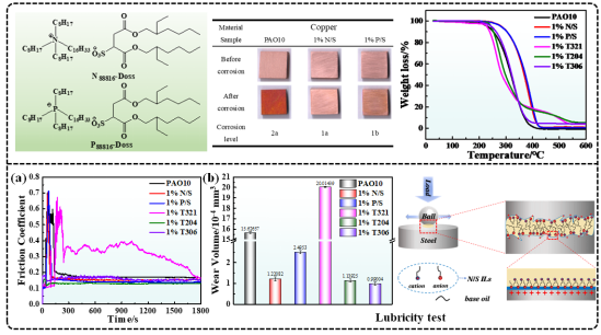 传统润滑油添加剂T321、T204及T306在极压条件下抗磨损性能优异,因而被广泛用于极压性油的配方中,然而传统添加剂由于存在刺激性气味、在热分解过程中会产生积灰、易对环境造成污染等问题。论文“Performance of oil-soluble ionic liquids as novel lubricant additives”从分子设计的角度出发,合成了两种阴离子相同而阳离子不同的新型绿色油溶性离子液体P88816-Doss和N88816-Doss,研究了它们在不同温度及不同工况下的理化性质和摩擦学性能并于传统润滑添加剂进行对比。实验结果表明,两种油溶性离子液体的加入,对基础油的热分解温度有较为明显的改善,且优于传统润滑添加剂。摩擦学测试结果表明,N88816-Doss具有较为优异的减摩抗磨性能与极压承载能力。此外,N88816-Doss的防腐性能优于基础油以及其他传统添加剂调和油。根据轴承钢表面磨斑的SEM、EDS及XPS分析结果可知,N88816-Doss是一种合适的基础油添加剂,有望进一步替代或部分替代传统润滑添加剂。这归因于N88816-Doss的性质及其在摩擦界面上形成的高质量摩擦化学反应膜,也为后续研究出性能更好、更绿色的润滑添加剂提供了一定思路。(研究生院、机械工程学院 文、图/史革盟 审核/凡明锦、王肖烨)