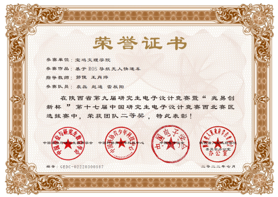 近日,陕西省第九届研究生电子设计竞赛暨“兆易创新”杯第十七届中国研究生电子设计竞赛西北赛区选拔赛在西安邮电大学长安校区举行。大赛由陕西省教育厅、陕西省学位委员会、中国电子学会联合主办,西安邮电大学承办,共32所高校、921支队伍参加竞赛。本届赛事采用了线上评审方式进行。开元由机械工程学院研究生袁磊、赵通、雷辰阳共同设计的“基于ROS导航无人快递车”(指导教师:郭便、王肖烨),获得西北赛区二等奖。