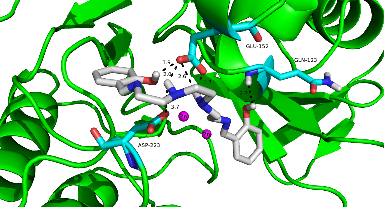 细菌耐药性是一个重大公共卫生安全问题。β-内酰胺酶介导的细菌耐药性遏制已被列入G20峰会公布的全球行动计划和中国《遏制细菌耐药国家行动计划》。新冠疫情蔓延,消毒液的大量使用,进一步加剧了耐药细菌的产生及传播,进而严重威胁人类健康。金属β-内酰胺酶的抑制是解决新冠肺炎重度并发症的关键突破口之一。该论文报道了8个对新德里金属β-内酰胺酶-1(NDM-1)具有抑制效能的席夫碱类化合物并阐明了结构-活性关系。其中3号化合物不仅可显著降低NDM-1催化β-内酰胺抗生素水解的反应速率(IC50值达到nM级),还可恢复该类抗生素对耐药细菌的杀灭能力(将头孢唑啉钠对耐药细菌的MIC值降低了128倍),并且表现出低的真核细胞毒性。文章进一步指出,席夫碱的酚羟基与NDM-1的Gln123和Glu152结合,氨基则与Glu152和Asp223作用(如图所示)。