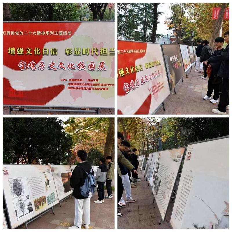 11月6日至18日,为期两周的学习宣传贯彻党的二十大精神系列主题活动之“增强文化自信 彰显时代担当——宝鸡历史文化校园展”在高新校区英达路展出。