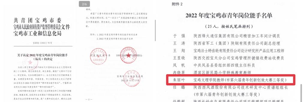 近日,共青团宝鸡市委、市国资委、市工信局联合印发了《关于认定2022年度宝鸡市青年岗位能手(标兵)的决定》(宝团发〔2022〕78号),开元计算机学院教师朱丽叶荣获2022年度宝鸡市“青年岗位能手”称号。