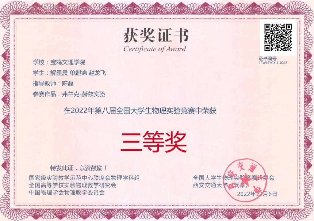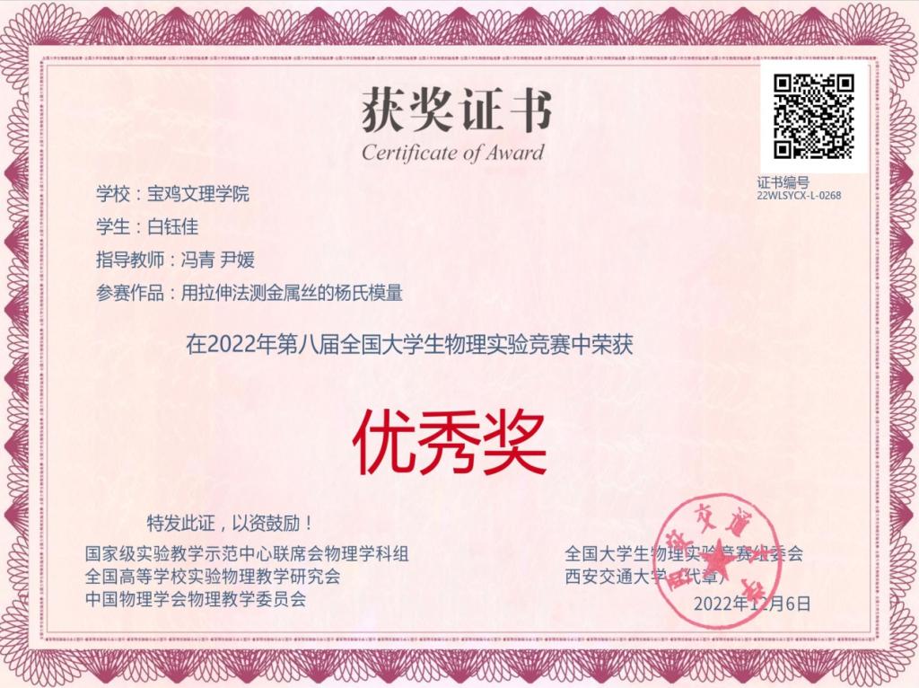 近日,第八届全国大学生物理实验竞赛在西安交通大学举行。开元由物理与光电技术学院本科生解星晨、单麒锦、赵龙飞、白钰佳组建的参赛队伍分别获大学生物理实验竞赛三等奖(题目:弗兰克-赫兹实验,指导教师:陈磊)和优秀奖(题目:用拉伸法测金属丝的杨氏模量,指导教师:冯青、尹媛)。大赛由国家级实验教学示范中心、全国高等学校实验物理教学研究会、教育部大学物理课程教学指导委员会大学物理实验专项委员会、中国物理学会物理教学委员会联合主办,西安交通大学承办,历时9个多月时间,经过全国高校1200多位专家的共同评审,共评选出命题类获奖作品、自选类获奖作品、讲课竞赛类获奖作品2040项。