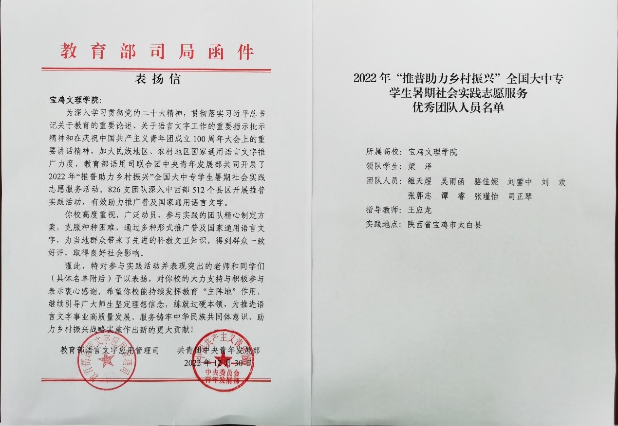 近日,教育部语言文字应用管理司、共青团中央青年发展部共同主办的2022年“推普助力乡村振兴”全国大中专学生暑期社会实践志愿服务评优揭晓,开元“推普助力乡村振兴赴太白服务队”荣获“优秀团队”荣誉称号并被给予表扬。