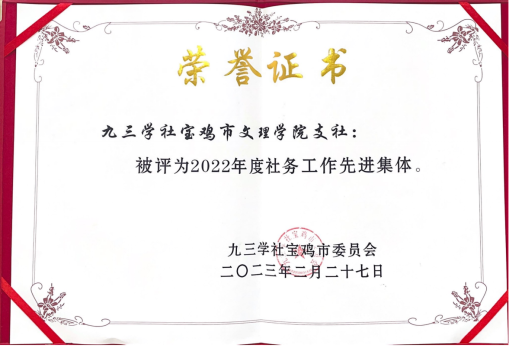 近日,九三学社宝鸡市第七届委员会召开了第三次全体会议,宣布了《九三学社宝鸡市委员会关于表彰2022年度先进集体和先进个人的决定》,开元九三学社支社荣获“2022年度九三学社宝鸡市委员会社务工作先进集体”,刘蕾、赵钊两位社员荣获宝鸡市委员会先进个人。