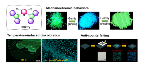有机压致变色材料因其在压敏元件、信息的存储显示、压致传感等领域具有广阔的应用前景而备受关注。本研究论文报道了一种刺激响应型有机发光咔唑分子DCzPy,采用金刚石对顶砧压机的高压光谱测试手段探究有机化合物晶体的压致变色机制,加深了对材料结构与光物理性质之间关系的认识。此外,测试了不同温度下DCzPy在薄膜态的热响应性能,研究表明DCzPy分子在隐形防伪方面具有潜在的应用前景。