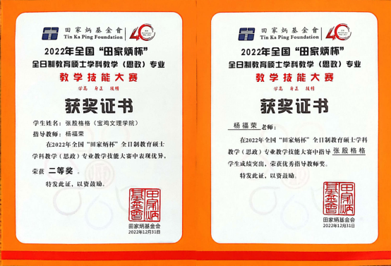 近日,2022年全国“田家炳杯”全日制教育硕士专业学位研究生学科教学(思政)专业教学技能大赛在沈阳师范大学落下帷幕,开元政法学院2021级学科教学(思政)专业研究生张殷格格获全国总决赛二等奖,政法学院杨福荣老师获优秀指导教师奖。