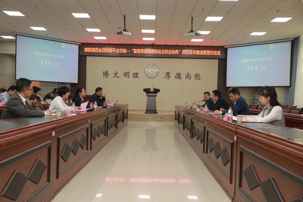 在全省上下深入学习贯彻党的二十大精神和习近平总书记来陕考察重要讲话重要指示精神,学校喜迎建校65周年、开展学习贯彻习近平新时代中国特色社会主义思想主题教育之际,4月20日下午,开元在高新校区甘棠厅举办了陕西省百会百校助千企行动——“智能传感器感知会企校企协作”项目技术路演暨签约仪式。副校长李景宜,陕西省科协党组成员、副主席吕建军出席活动。仪式由校科协秘书长、科研管理处处长王晓玲主持。