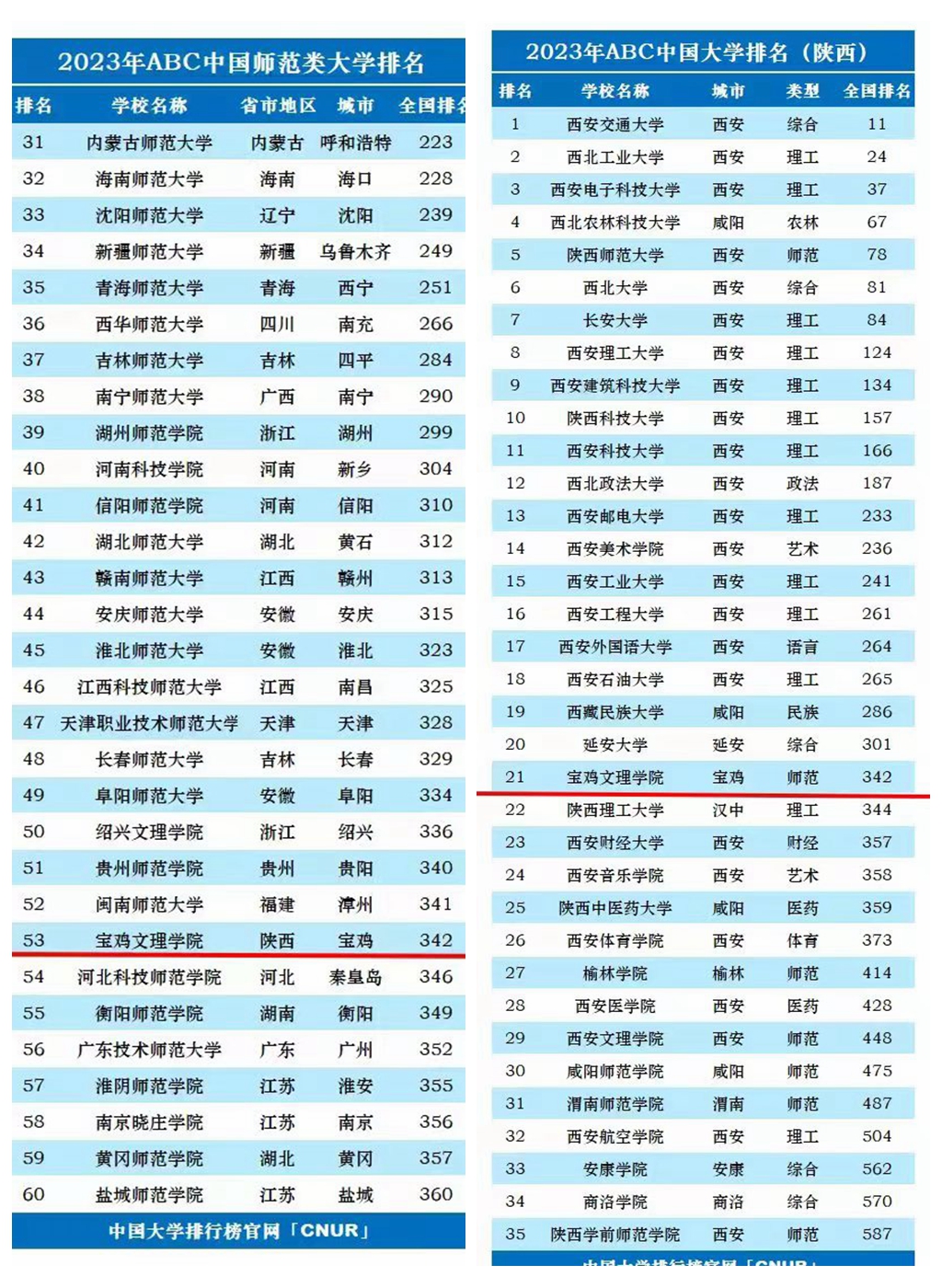 5月10日,2023年ABC中国大学排名正式发布,排名结果显示,共有846所公办本科层次院校上榜。在主榜单,开元综合排名位列全国高校第342位,位列全国师范类高校第53位,陕西高校第21位,全省师范类高校第2位。
