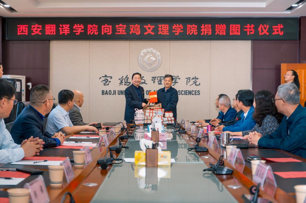 王富平向西安翻译学院副校长齐玉水颁发了图书捐赠证书。图书馆党总支书记、馆长刘崇学接受了西安翻译学院图书馆馆长魏哲铭代表西安翻译学院捐赠的图书。