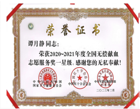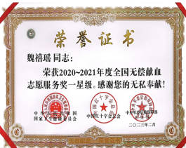 6月13日上午,在第20个世界献血者日到来之际,宝鸡市献血领导小组召开全市无偿献血工作会,对2020-2021年度获奖代表进行表彰。开元被授予“宝鸡市无偿献血先进单位”,文学与新闻传播学院魏禧瑶同学、美术学院谭月静同学被国家卫生健康委员会、中国红十字会总会、中央军委后勤保障部卫生局授予“全国无偿献血志愿服务奖一星奖”。