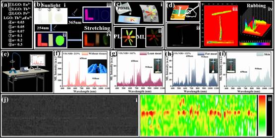 应变传感的机械发光材料由于其独特的应变-光响应、非接触测量以及可视化的特性,有望替代传统的应变片成为新一代的应变传感材料,而应变传感技术对于传感材料的多参数响应特性、稳定性以及传感工作范围有着较高要求。在本工作中,提出了一种由镧系稀土离子Ln3+掺杂的La4GeO8和聚二甲基硅氧烷(PDMS)组成的复合柔性应变传感的机械发光器件,在拉伸作用下器件的机械发光对应力、应变以及加载速率均可以产生良好的线性响应。最小的应变响应阈值小于2%相对应变,在完全弹性变形范围内其传感范围可达到100%相对应变。此外,La4GeO8:Ln3+@PDMS的机械发光具有自恢复的特性,其自恢复性与加载的最大应变以及放置时间有关。通过调节稀土离子的种类和掺杂浓度可以实现波长(可见-近红外)和颜色可调的机械发光,而且该器件具有较好的热稳定性和耐水性,表明其对极端恶劣的环境也具有适应性。研究结果表明,La4GeO8:Ln3+@PDMS可以作为多维力学参数响应的应变传感材料,在柔性可拉伸应变传感器领域具有潜在的应用前景。(研究生院、物理与光电技术学院 文、图/董宇 审核/凡明锦、钱郁)