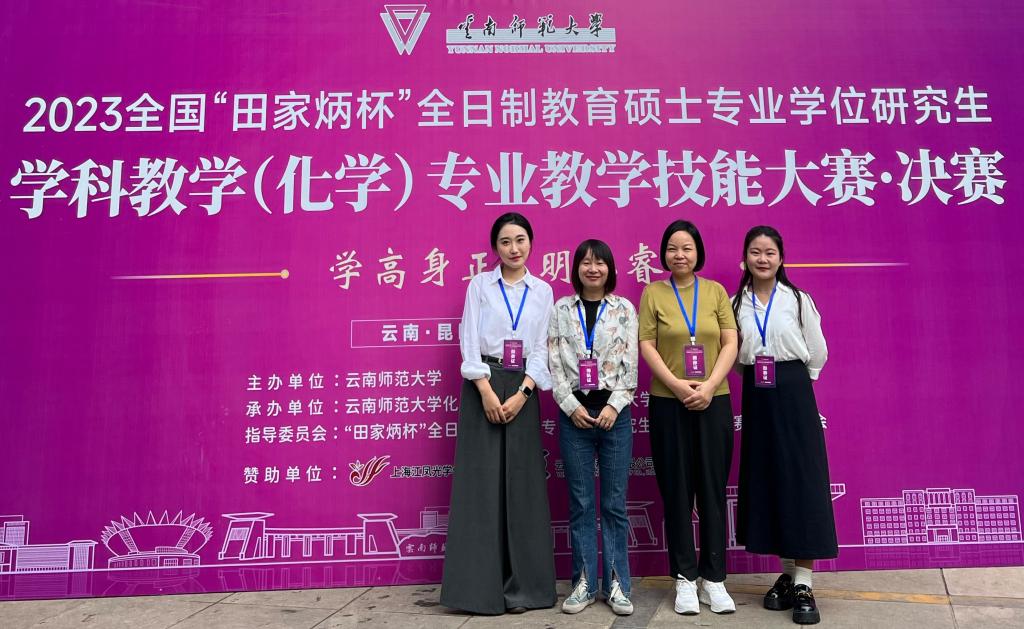 近日,由全国教育专业学位研究生教育指导委员会主办、田家炳杯基金会冠名的2023年全国“田家炳杯”全日制教育硕士专业学位研究生学科教学(化学)专业教学技能大赛决赛在云南师范大学落下帷幕。化学化工学院2022级研究生谢雨欣(指导教师:马琳)荣获大赛三等奖,赵瑞娇(指导教师:任莉君)获得优秀教学设计奖。