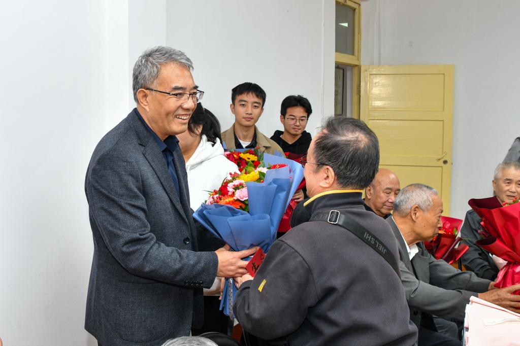 赵健代表全体师生祝贺老同志八十岁生日快乐,并为老同志送上鲜花、慰问金和生日蛋糕。他指出,各位老同志经历和见证了祖国从站起来、富起来到强起来的伟大飞跃,见证了学校从长寿山校区到石鼓校区,再到高新校区的跨越式发展,为国家、社会和学校贡献了青春和力量,期待大家一如既往地支持学校事业发展,坚持不断学习和积极锻炼,永葆乐观豁达良好心态。他要求学校相关部门和离退处工作人员广泛听取老同志所需所想所愿,竭尽全力为老同志做好服务。