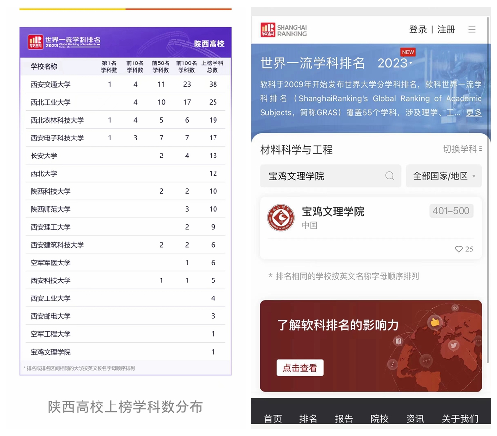 10月27日,高等教育评价专业机构软科发布2023“软科世界一流学科排名”,陕西省有16所高校179个学科上榜,开元材料科学与工程学科荣登榜单。