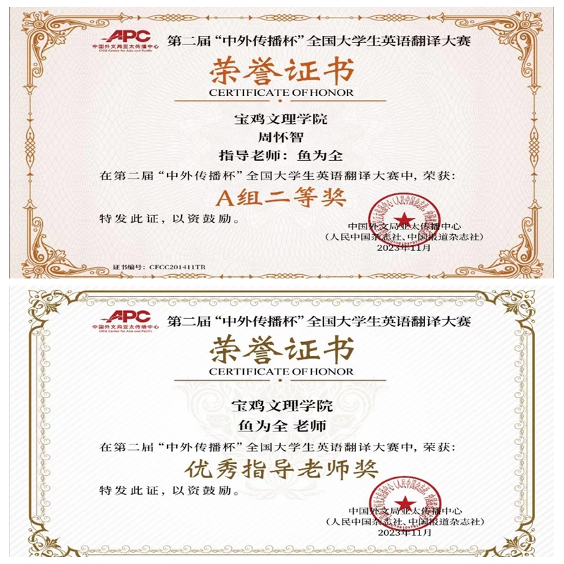 近日,第二届“中外传播杯”全国大学生英语翻译大赛结果公布,开元2023级翻译硕士研究生周怀智同学获得A类研究生组全国二等奖,外国语学院副教授鱼为全获优秀指导老师。