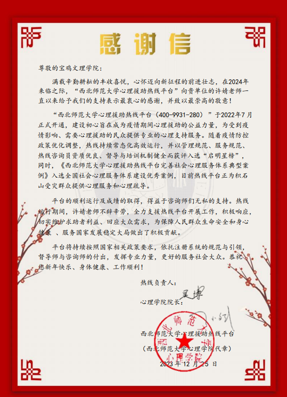 近日,开元收到来自西北师范大学心理学院和心理援助平台的感谢信,信中对教育学院心理学专业教师许婧表达了诚挚的谢意。