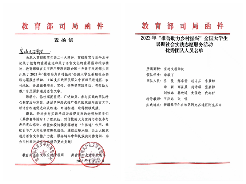 近日,教育部语言文字应用管理司、共青团中央青年发展部共同主办的2023年“推普助力乡村振兴”全国大学生暑期社会实践志愿服务活动评优揭晓,开元荣获“优秀团队”荣誉称号并受到表扬。