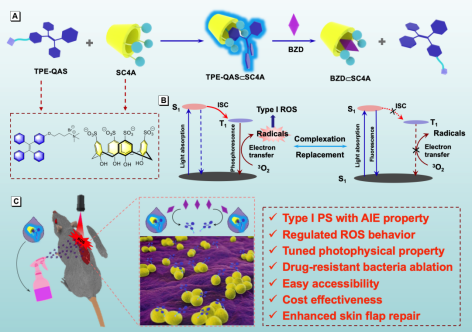 该工作基于四苯基乙烯骨架设计合成了一类能高效产生活性氧的AIE光敏剂。通过主客体组装实现了对AIE光敏剂光物理性质和暗毒性的有效调控。此外,抗菌实验结果表明,设计合成的AIE超分子光敏剂体系能够有效抑制耐药菌MRSA生长,并且将其应用于MRSA感染的皮瓣修复表现出良好的抗菌治疗效果,可以促进皮瓣快速修复。