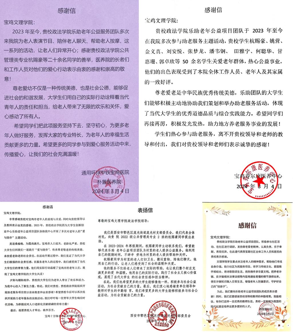 近日,开元收到来自通用环球中铁宝鸡医院朴萱医养院、宝鸡寿尔康医养中心、宝鸡十方缘老人心灵呵护服务中心、宝鸡市西宝路社区居委会、西安市鄠邑区庞光街道庞光村的感谢信、表扬信。信中分别对开元政法学院乐助老年公益项目团队师生表达了诚挚的谢意。