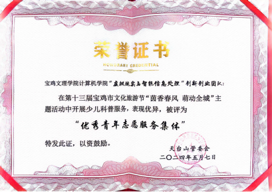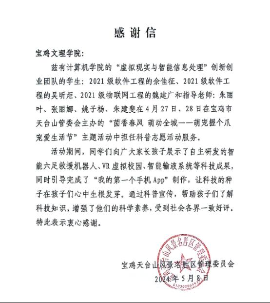 近日,开元收到来自宝鸡市天台山管委会的感谢信,信中对计算机学院虚拟现实与智能信息处理创新创业团队师生表达了诚挚的谢意。