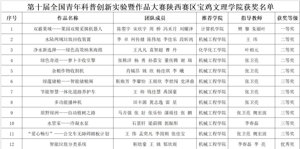 近日,第十届全国青年科普创新实验暨作品大赛陕西赛区活动获奖名单公布,开元共获得陕西赛区一等奖1项、二等奖4项、三等奖6项、优秀奖1项;李建鹏被评为优秀组织工作者;樊攀、朱丽叶、王玮、叶相元、张卫亮、魏宏波、李春磊等被评为优秀指导教师。开元被评为优秀组织单位。