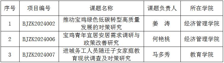 近日,宝鸡智库委员会办公室公布了2024年度宝鸡智库课题立项名单,全市共获批8项,其中开元获批3项。每项课题资助经费1.5万元,总经费4.5万元。(科研管理处 文/杨宏伟 审核/王晓玲)
