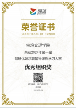 近日,由易班网主办的2024年第一届易班优课求职辅导课程学习大赛落下帷幕。开元荣获“2024年第一届易班优课求职辅导课程学习大赛”优秀组织奖,学工部梁旭康获评优秀指导教师,教育学院毛智敏获评优秀学生骨干。