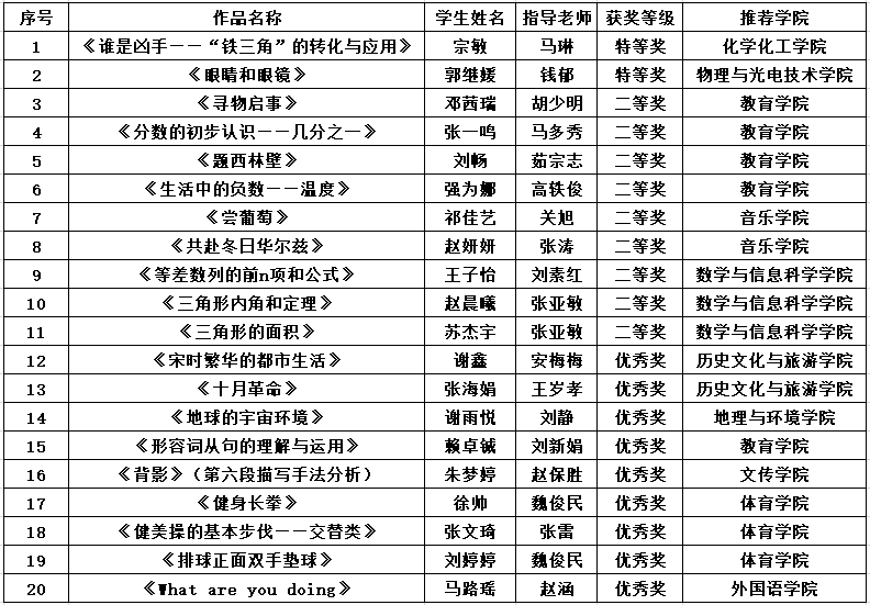 大赛设置校赛、全国决赛两级赛制。开元于今年1月至3月举办校赛。校赛阶段共收到各学院参赛作品60件,教育学院组织专家从创意创新、选题价值、作品规范、教学内容、教学效果五个方面对参赛作品进行评审,推荐20件作品参加全国决赛。各参赛团队不断对作品进行打磨,修改完善,努力提高作品质量,最终凭借扎实的教学设计及信息技术应用能力,取得了可喜的成绩。