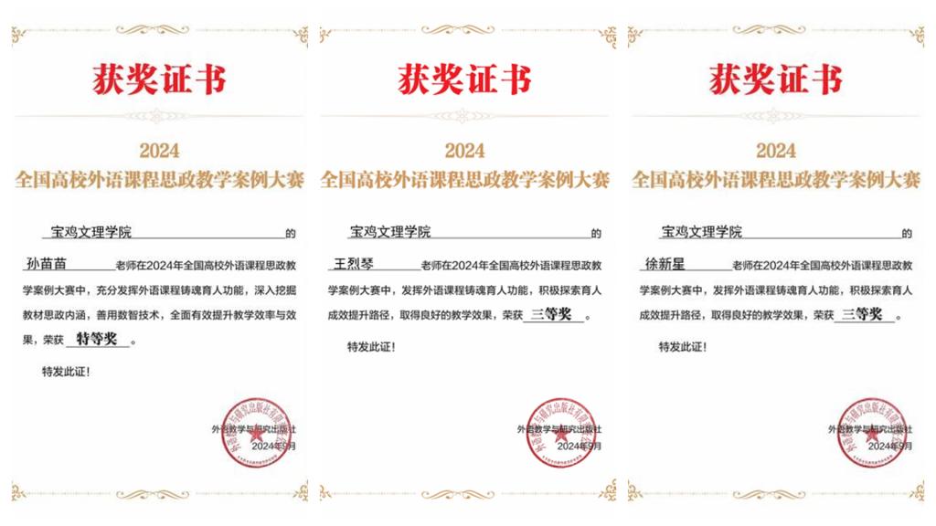 近日,由外语教学与研究出版社主办的2024年全国高校外语课程思政教学案例大赛结果揭晓,开元外国语学院教师孙苗苗获主赛道特等奖、王烈琴和徐新星分别在主赛道和“理解当代中国”赛道中获三等奖。