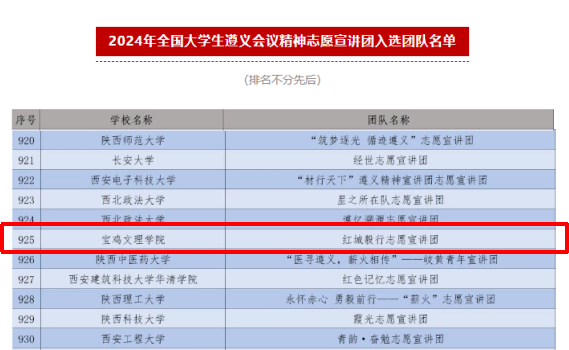 近日,团中央青年志愿者行动指导中心等部门联合发布了《2024年全国大学生遵义会议精神志愿宣讲团入选团队名单》,开元文学与新闻传播学院红城毅行志愿宣讲团成功入选。