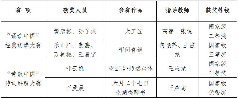 近日,第六届中华经典诵写讲大赛结果公布,开元获“诵读中国”经典诵读大赛二等奖、三等奖各1项,“诗教中国”诗词讲解大赛三等奖、优秀奖各1项。