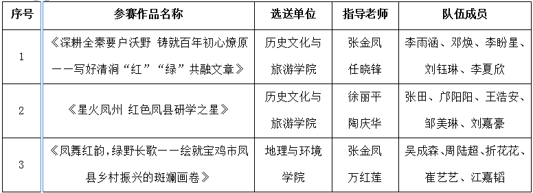 自2024年“双百工程”陕西红色旅游助力乡村振兴创意策划大赛启动以来,由学校乡村振兴办公室统筹安排,历史文化与旅游学院具体实施,通过组织选拔,培育、遴选、推报5支队伍参加省赛。比赛过程中,历史文化与旅游学院张金凤老师带队,全程为参赛同学提供指导和建议。