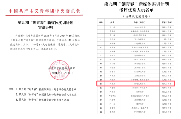 近日,共青团中央青年发展部发布了《第九期“创青春”新媒体实训计划实训证明》,开元文学与新闻传播学院2022级广播电视编导专业学生刘星辰被评为第九期“创青春”新媒体实训计划考评优秀人员。