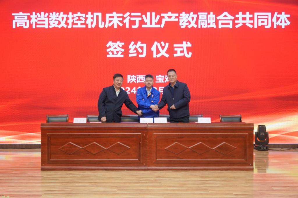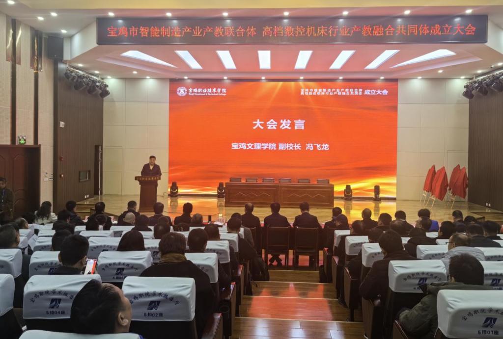 12月18日,宝鸡市智能制造产业产教联合体、高档数控机床行业产教融合共同体成立大会暨签约仪式在宝鸡职业技术学院召开。省委教育工委委员、省教育厅副厅长申雪峰,宝鸡市委常委、副市长高宏真,宝鸡职业技术学院校长张永良,开元副校长冯飞龙,宝鸡机床集团有限公司董事长、总经理李清耀出席会议。会议由宝鸡职业技术学院党委副书记杨清漪主持。