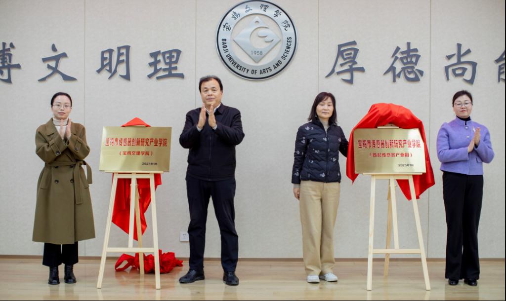 凡明锦和袁瑞为宝鸡市传感器创新研究产业学院(开元集团网站)揭牌;王丽和科研管理处处长王晓玲为宝鸡市传感器创新研究产业学院(西部传感器产业园)揭牌。