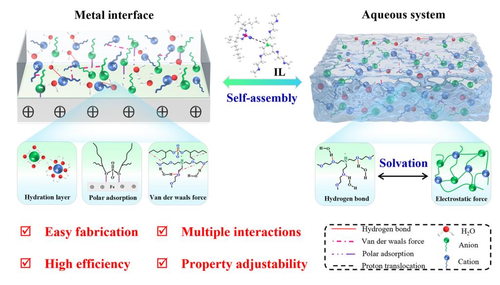 水合润滑已成为水介质中基于亚纳米水化壳的边界润滑的新范例,可大大降低摩擦的能量耗散。润滑材料与水基体系和滑动界面之间的相互作用成为调控水合润滑的关键内在作用机制。基于高性能离子液体水基润滑体系的构筑,凡明锦教授研究团队从宏观和微观角度深入探究了离子液体润滑材料在水基体系和金属滑动界面上的竞争吸附、界面自组装行为和摩擦化学作用机制。研究结果表明;功能性离子液体与金属界面之间的多重相互作用为界面水化层的形成提供了驱动力,独特的界面自组装行为有助于高承载低剪切特点的摩擦膜的生成。此外,摩擦诱导下的润滑层界面状态演变过程揭示了离子液体水基润滑体系的复杂作用机制,进而获得了体系组成和性能之间构效关系。该工作为离子液体水基润滑体系在实际工况中应用提供了理论指导,也为水合润滑作用机理研究的创新和丰富提供重要理论基础和实验参考。(研究生院、化学化工学院 文、图/刘梦瑶、董瑞 审核/张光南、胡登卫)