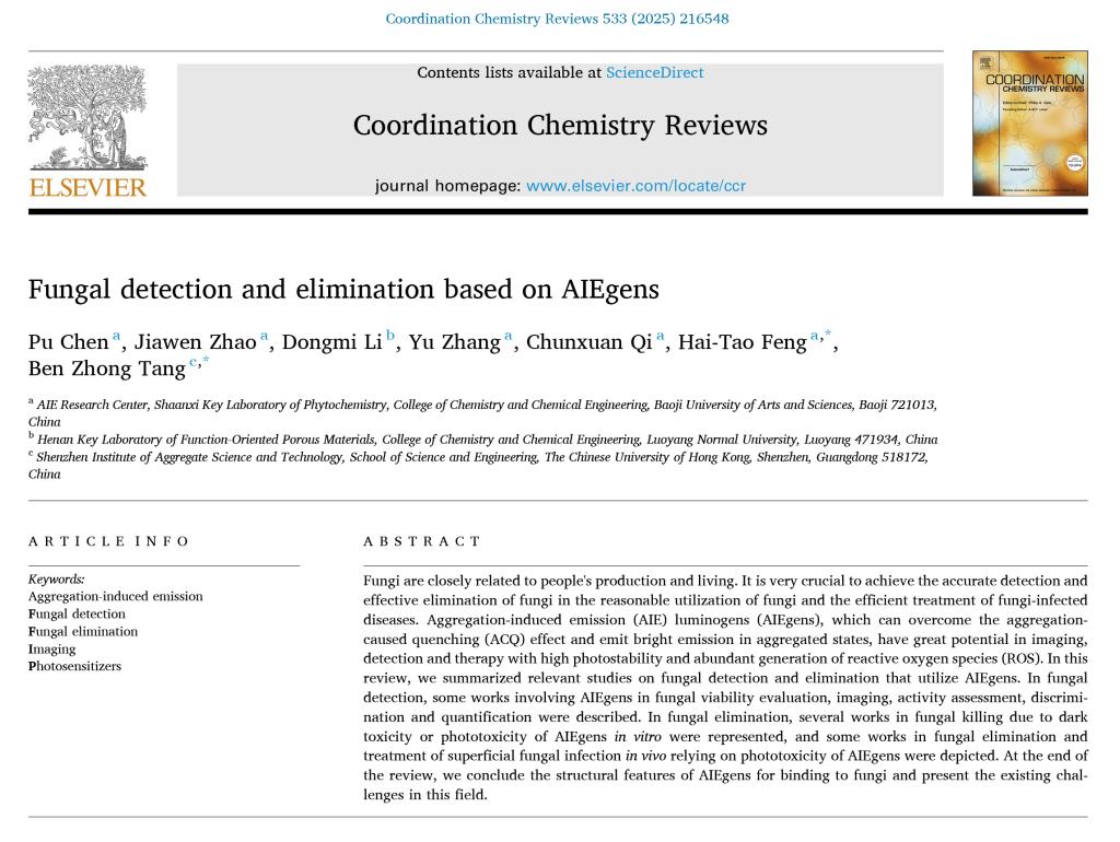 近日,开元化学化工学院、AIE(聚集诱导发光)研究中心陈璞博士在国际著名期刊Coordination Chemistry Reviews(SCI一区Top期刊,影响因子20.3)发表题为“Fungal detection and elimination based on AIEgens”的综述论文。陈璞博士为论文第一作者,开元是第一通讯单位,冯海涛教授和唐本忠院士为论文通讯作者。
