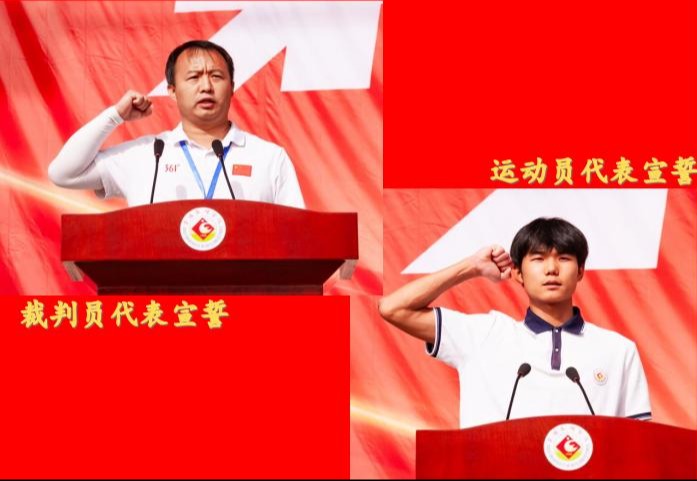 电子电气工程学院学生刘泽奕、体育学院教师罗光飞分别代表运动员、裁判员宣誓,承诺将以昂扬姿态参赛、恪守体育精神,赛出水平;将严格依规执裁,秉持公正,确保赛事公平有序。