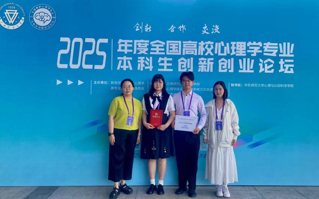 近日,2025年度高校心理学专业本科生创新创业论坛决赛在昆明落下帷幕。教育学院应用心理学专业李怡欣、江理文的作品《解忧事务所APP》获产品设计二等奖,汝晶、苏乐凡的作品《小丑Joker——探索边缘型人格障碍》获短视频科普三等奖,许婧获优秀指导教师。
