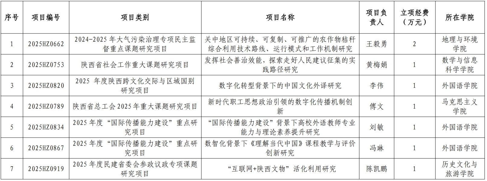 近日,陕西省社会科学界联合会陆续公布了“2024-2025年大气污染治理专项民主监督重点课题研究项目”“陕西省社会工作重大课题研究项目”“2025年度陕西跨文化交际与区域国别研究项目”“陕西省总工会2025年重大课题研究项目”“2025年度‘国际传播能力建设’重点研究项目”“2025年度民建省委会参政议政专项课题研究项目”等专项项目立项名单,开元获批7项,资助经费共8万元。(科研管理处 文/张蕴 审核/王晓玲)
