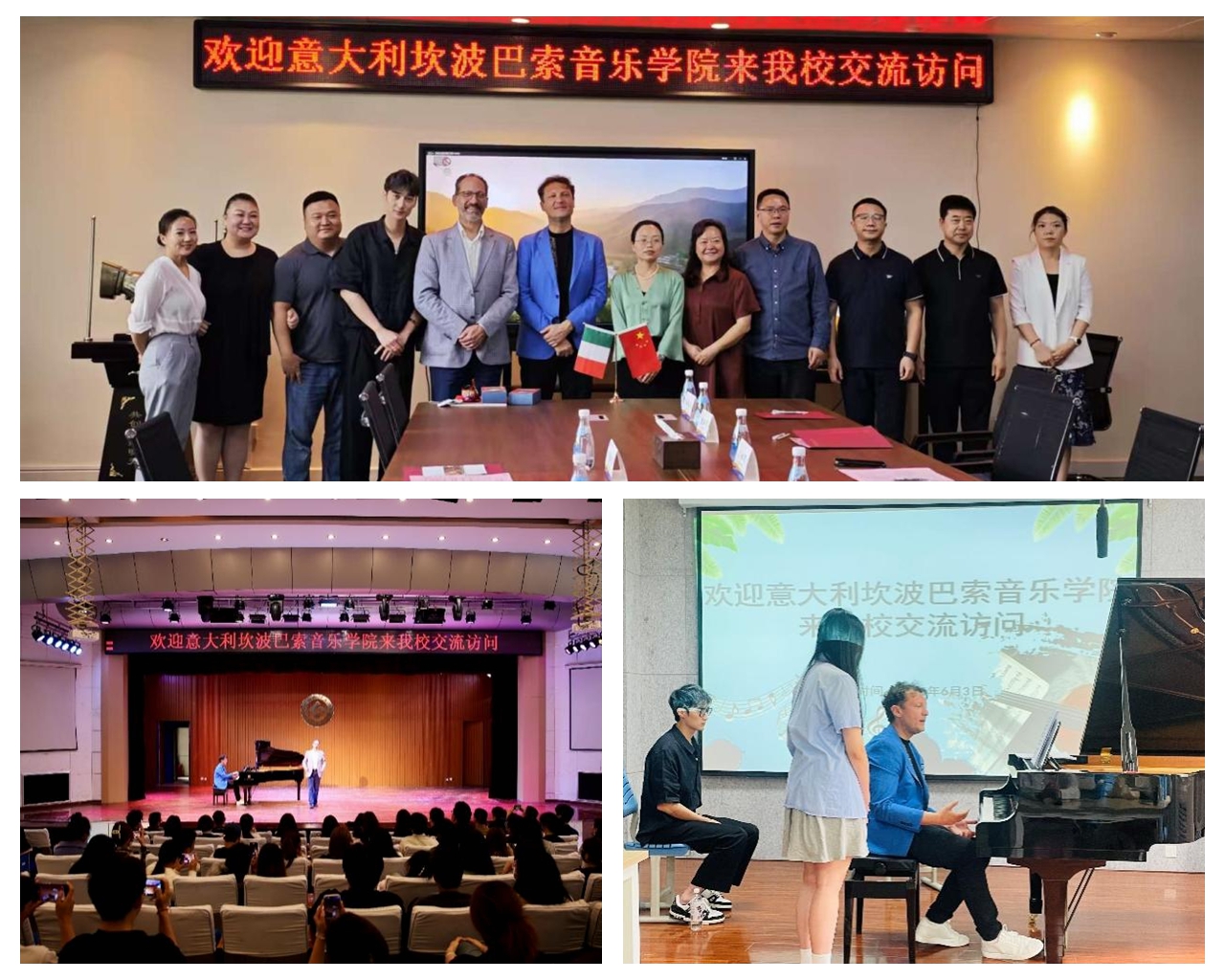 座谈会后,意大利代表团前往音乐学院,与开元师生展开现场交流,并共同举办了音乐交流会与声乐大师课。活动中,阿尔托马雷教授以“歌剧赏析与古典发声技巧”为主题进行讲授与示范,赢得在场师生热烈反响。课堂互动充分,艺术氛围浓厚,进一步加深了两校在音乐表演与教学方法上的互学互鉴。