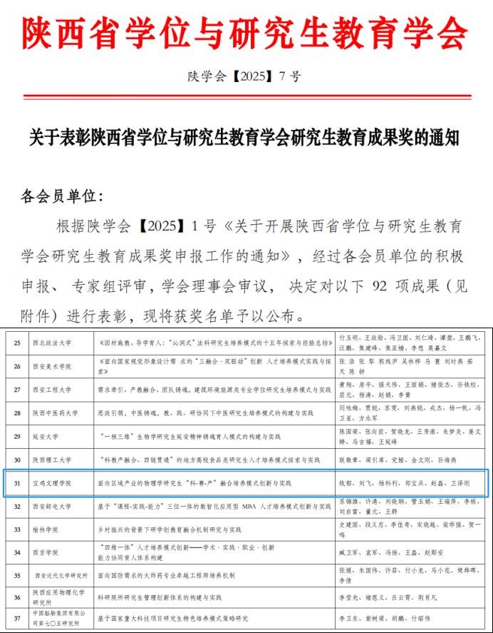 近日,陕西省学位与研究生教育学会发布《关于表彰陕西省学位与研究生教育学会研究生教育成果奖的通知》(陕学会〔2025〕7号),开元物理与光电技术学院钱郁教授主持的《面向区域产业的物理学研究生“科-赛-产”融合培养模式创新与实践》研究生教育成果荣获二等奖。