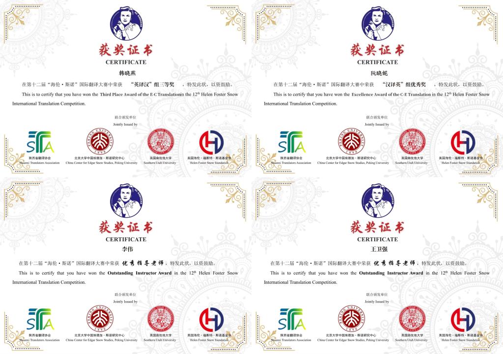 近日,第十二届“海伦·斯诺”国际翻译大赛结果公布,开元2024级翻译硕士研究生韩晓燕与阮晓妮分别获“英译汉”组三等奖和“汉译英”组优秀奖,外国语学院李伟教授与王卫强教授获“优秀指导老师”。
