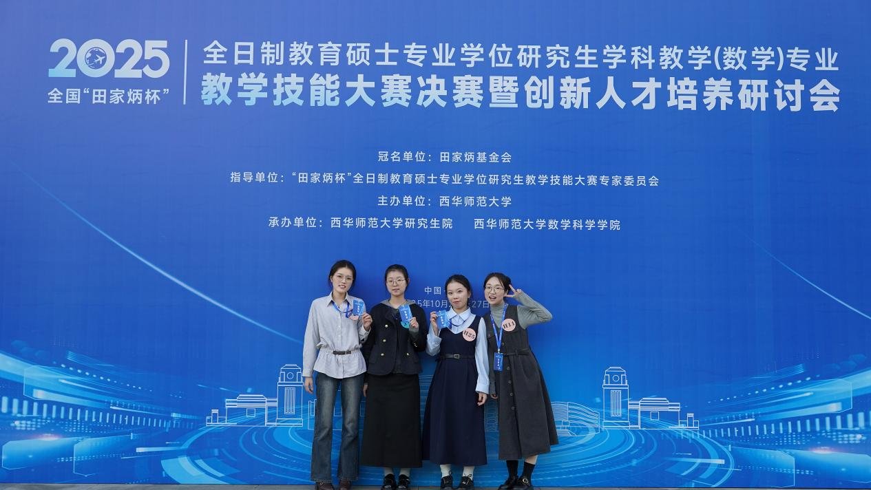 近日,2025年全国“田家炳杯”全日制教育硕士专业学位研究生学科教学(数学)专业教学技能大赛决赛在四川南充举行。开元2024级学科教学(数学)专业硕士研究生梁奕晨同学获得国家二等奖,王思雨、徐春蕊和张晨钰三位同学获优秀教学设计奖。