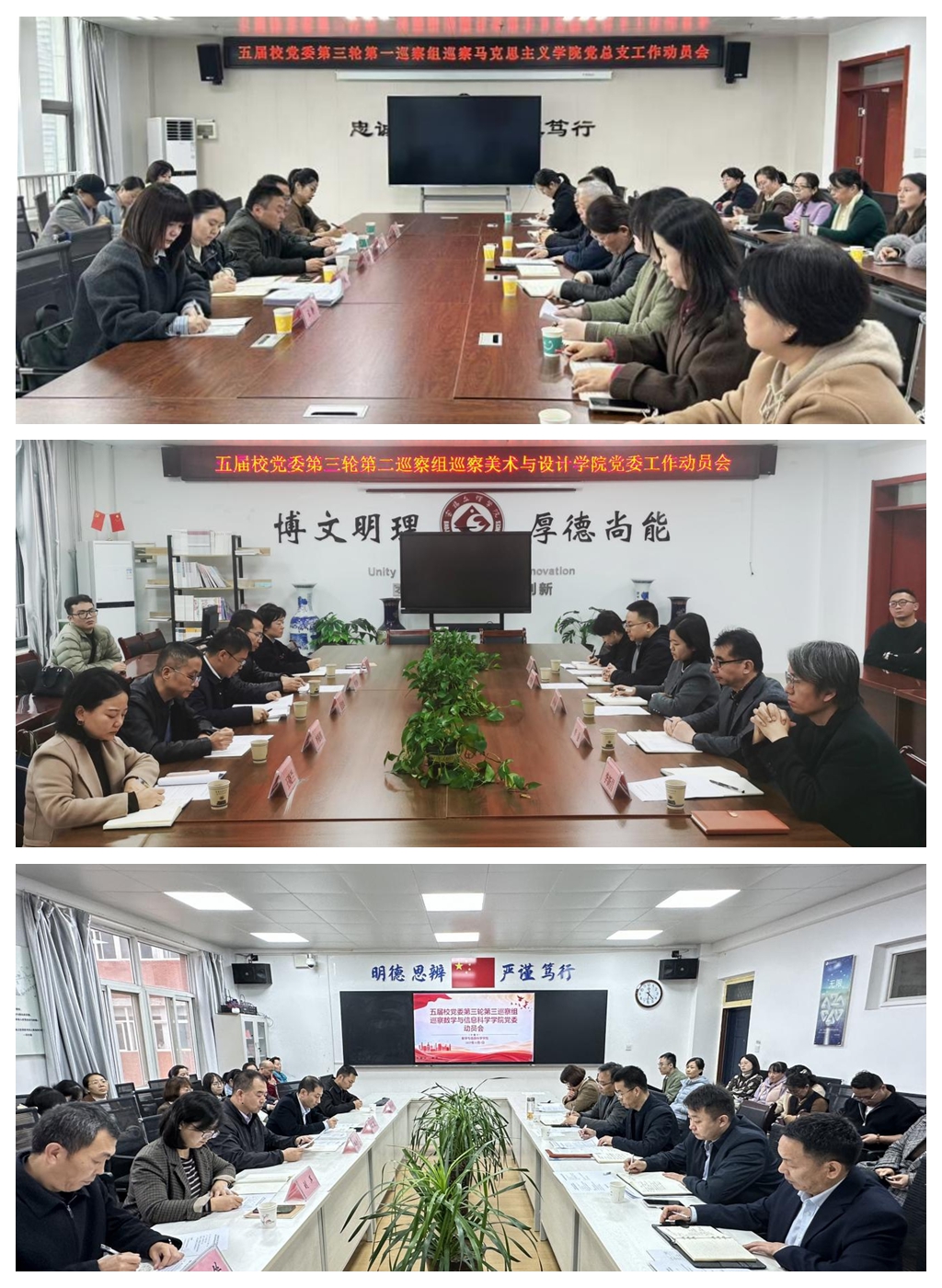 11月3日,五届校党委第三轮第一、第二、第三巡察组分别召开巡察马克思主义学院党总支、美术与设计学院党委、数学与信息科学学院党委进驻动员大会,巡察组全体成员、被巡察学院全体教职员工参加会议。会议分别由马克思主义学院党总支书记赵智劳、美术与设计学院党委书记崔小丽、数学与信息科学学院党委书记许元明主持。